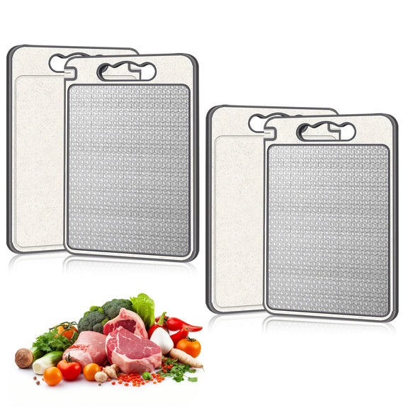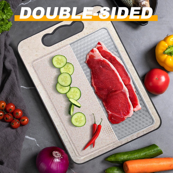 【DUAL-SIDED CUTTING BOARD DESIGN】Our Stainless Steel Cutting Board Features a Versatile 2-In-1 Design—One Side is Made Of Food-Grade 304 Stainless Steel, Ideal for Cutting Meats, While The Other Side Is Made of Bpa-Free Wheat Straw Fiber, Suitable for Vegetables and Fruits.Ensuring Your Kitchen Stays Hygienic
